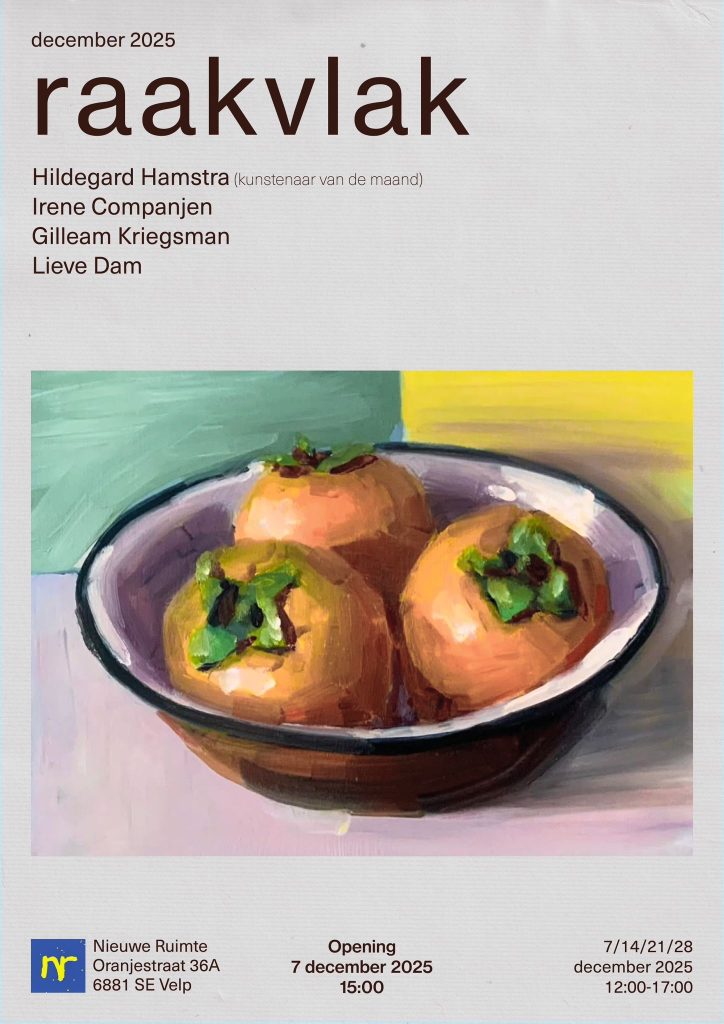 Met als titel Raakvlak presenteert Nieuwe Ruimte, het podium voor beeldende kunst in de gemeente Rheden van 7 t/m. 28 december ’25 een expositie met werk van de kunstenaar van de maand Hildegard Hamstra. Mede-exposanten zijn Irene Companjen, Gilleam Kriegsman en Lieve Dam.