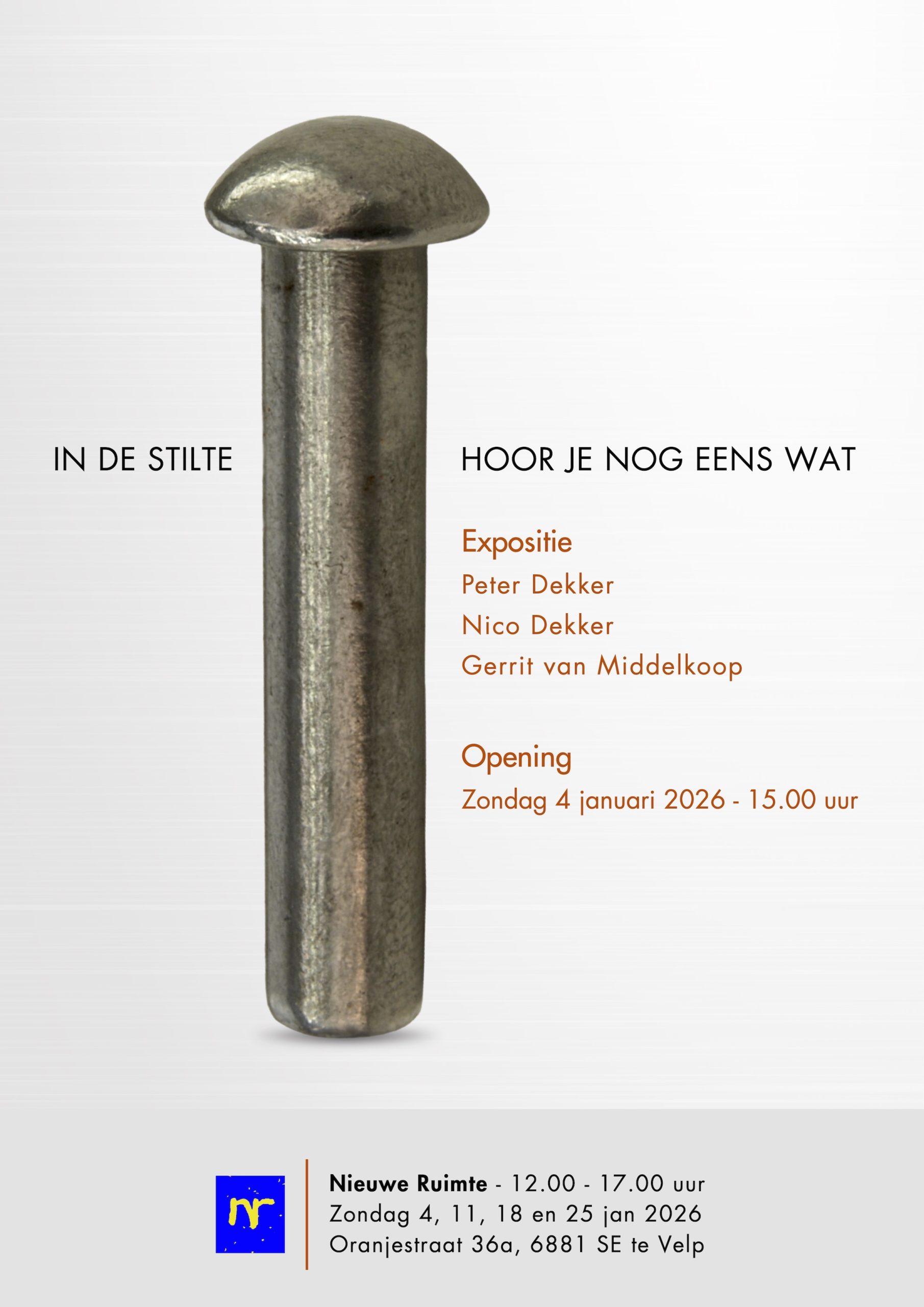 Met als titel ‘In de stilte hoor je nog eens wat’ presenteert Nieuwe Ruimte, het podium voor beeldende kunst in de gemeente Rheden van 4 t/m. 25 januari 2026 een expositie met werk van de kunstenaar van de maand Peter Dekker.